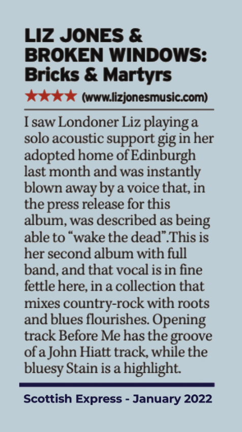 Long time songwriter and singer, Liz Jones, moved to Scotland on a whim in 2011. Jones rejected an all consuming career in television production, finding a casual musical home in Scotland as she mixed with the local blues and roots scenes. Coming from London and Cumbria, she began focusing on music after a 5 year period running a cafe in Edinburgh. Support from several 'Broken Windows' members, to make her original songs rise in a band setting, began the full fat group that is now her main project. Jones also tours successfully as a solo artist, across the UK and Netherlands, at heart a storyteller and song-maker, but there is within her a natural tendency to 'rock out' and drive a big stage. Broken Windows brings out another pique of her voice and performance, co-writing and collaboration with John and the band, giving her full scope to embrace the blues, jazz, folk and psychedelic influences.